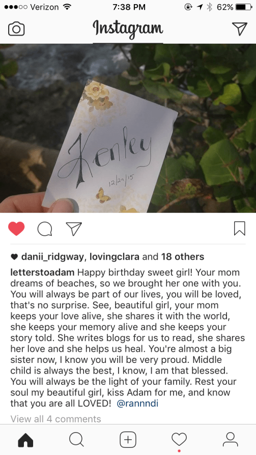All throughout the day I was getting texts from people all over letting me know that she was on their minds, and that she was missed. I woke up to a specific Instagram tag from a woman who lost her son last year about a week or two before we lost Kenley. I don’t know what specifically about her words struck a chord with me, but it sort of set my tone for the day. I think it was what I was meant to see on the morning of her first birthday.