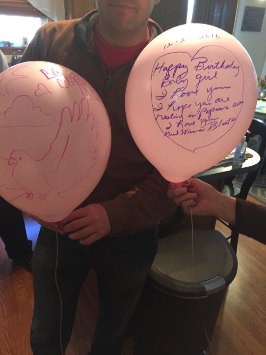 We had a christmas gift exchange with my Dad and Sister before everyone showed up at 2 for the “party”. I wasn’t sure that I wanted to do this, as it felt like it was taking away from her, but ultimately I’m glad we did. Then, around 2, Shane’s family showed up. We all just kind of hung out for a little bit, then had lunch. We ate, and decided that we would do the balloon release. Everyone wrote or drew on their balloons (only popped 2!) and then we made our way outside. It was extremely windy, but so clear. Landon counted to 3, and we all let them go. It felt good to watch them float away. I kept my message short and simple. She knows how much I love her, so my balloon was just a small reminder of that.