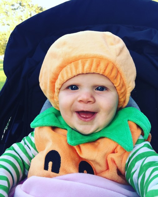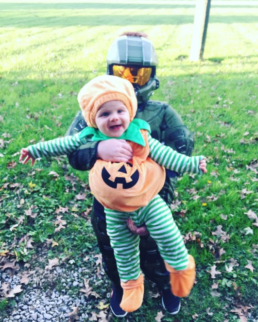Last night was trick or treat in our town. Landon was Master Chief from Halo (a game he has never played before in his life….but he liked the way the costume looked lol) and Alden was a pumpkin. I wanted her to be a cute little unicorn, but I procrastinated and put off buying it then of causer it sold out and everyone wanted me to pay like $70 for it on eBay and I was not going to do that. So, yesterday after our appt we went to Target and bought her the pumpkin outfit. She looked SO cute. The little hat smushed her face LOL, but it was still adorable. I felt bad because it was freezing cold, and she would of course rip off mittens, but she wore a blanket pretty well and had a good time I think.